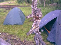 Expedice zacina opet v Ivalu. Letadlem na letiste a tentokrat jsme meli stesti, z letiste do kempu nas vzal dobrosrdecny Ital, ktereho nadchly nase plany prochodit Laponsko krizemb krazem. Pocasi je pekne. Mel jsem tri ruzne prepovedi (britska metosluzba, Forecast a finska meteosluzba), vsichni vestili ruzne pocasi, slunicko nemelo byt. Ale je. Jeden finsky vojensky turista mi psal, ze letosni komari jsou velci a doporucil brokovnici. Zda se, ze mel pravdu.
