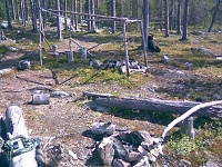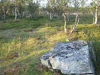 Samske (laponske) pohadky jsou myticke, drsne, usmevne a mnohdy ani ne pro deti. Skutecnost je (zvlaste dneska) mnohem prozaictejsi. Vsichni ziji v civilizaci, tajemne sily prirody je uz prilis neoslovuji - a tech 10 %, kteri se venuji tradicnimu sobareni, zajimaji spis motorky a vrtulniky, kterymi soby nahaneji - nebo (s odpustenim) chlast, kterym se rozdovadeji. Popravde receno, nedivim se, jsou tydny bez zensky a rodiny jen nekde v pustine (v zime ledove), co maji delat. Potkali jsme takovou jednu chajdu, kde prrespavaji. Curbes, plaechovky od piva, flasky od chlastu, kanystry od oleje, stare pasy ze skutru, potrhane site, polamamane zarizeni chajdy, postel, na niz bych teda spat nechtel, polorozpadla sauna vyspravena prkynky a plechem a papundeklem. Tak jsem vam radeji vyfotografoval hezkej sutr u jezera, kam jsme dneska dosli. Jezero se asi nijak nejmenuje. Nebo se jmenuje, ale nepisou to do map, aby turisti nevedeli. Podivam se doma na finske specialkya pripadne doplnim. Neusli jsme toho moc. Neni to ale lenosti, ani spatnym terenem (ode dneska jdeme podle sobich ohrad, coz znamena v 50 % sobi cesticku a ve zbytku mensi skaly, nez byly dosud) ale mym podvrknutym kotnikem. Nastesti jen trosicku, takze se dari jen trochu pomaleji. PS: MUZETE NAM NECHAT VZKAZY V DISKUZI NA KONCI STRANKY.