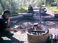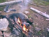 Ac jsme chteli jit dal, nakonec tu zustavame. Na druhe strane reky bylo pekne taboristatko. Nadherny vecer. Spousta zazitku, je treba to probrat a napsat do deniku. Kolikrat se mi stane, ze odpocivam u jezera, kde mozna posleednich sto let nikdo nesedel, snad krome sobu...