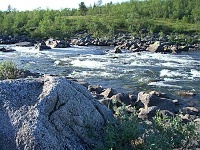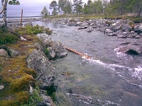 Suolisjarvi je velke jezero ktere se tahne na sever od jesera Inari. Nema samozrejme ani delku 50 km, ani rozlohu stovky ctverecnich kilometru, ale velke je. Na jih od nej je jezero Kyyneljarvi, tam nekde jsme spali na dnesek. Jezero Kyyneljarvi ma asi o pul metru nizsi hladinu, tak tu vznikla dvestemetrova reka, ktera tenhle spad prekonava. Vody je potreba pretransportovat asi hodne, protoze proud je hooodne prudkej. Hezky pereje! Letos je relativne sucho, prebrodili jsme to s vodou po kolena, ale jedna Finka, ktera mi radila s cestou, tu byla pred tremi lety v cervnu, musela porazit par borovic, udelat "most" a jeste na nem mela vody skoro po rozkrok. Legendy hovori i o nepruchodnosti, i o preskakani suchou botou. Brozeno to byva zrejme casto, soude po cerstvych stop vaellusaku na obou stranach, zvlastni je, ze sem ani z jedne strany nevede sememensi naznak cesticky. Jdeme dal...