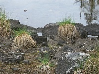 Stale rikam, jak je malo vody v jezerech. Vsude. Cestou, jak jdu po ceste Saamen-polku, vidam v jezerech hodne sutru na brehu a take blata. Tam, kde bezne byva voda. Dukazem toho jsou i tyhle trs travy; je dobře videt, kolik toho je bezne pod vodou. Mnozstvi vody v laponskych jezerech je dano predevsim tim, jaka byla zima. Malo snehu, malo vody...