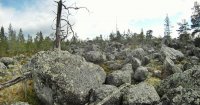 Jak bylo moudre nechat batoh ve srubu jsem ocenil pri dalsi ceste smerem k Iso Rovijarvi (Velke jezero Rovi). Puvodne jsem tam chtel dojit i s batohem, prejit k Pikku Rovijarvi a kolem nejakych soutesek se dostat az k norskym hranicim. Prsave pocasi a naprosto nemozny teren, pripomnajici kamenolom po nepodarenem odstrelu, navic v pomerne velkem svahu, me primelo k mirne zmene planu. Mozna by o kilometr vedle byl teren schudnejsi, nevim. Z mapy vubec neni patrne, ze tu jsou nejake velke sutraky a satelitni snimky toho take moc nereknou, navic nemaji buhvijake rozliseni. Dokonce jsem nasel zaznam z GPS jednoho finskeho dobrodruha, ktery prave tudy prosel a stihal vice jak 15 kilometru denne s velkou zatezi. Ja je dneska udelal take, ale nalehko.