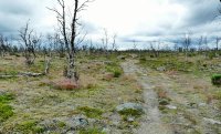 Spatny den. Vcera bylo cely den slunicko a teplo, zrali komari, uz v noci mi nebylo nejlip. Dneska to pokracuje. Cesta je fakt bezvadna, podivejte na fotku. Jestli nekdo mezi tema skalama objevi stezku, ma u me korunu. Ale byla tam, takova neznatelna, jaakoby vyslapana od sobu - kdyby na ni nelezela flaska od piva, neveril bych, ze neni od sobu. Predvcirem jsem se rozhodl, ze nepujdu delsi cestou na byvalou farmu Jankila, vybral jsem si cestu, ktera zacinala jako pisecna silnice, pak cesticka proo motorove ctyrkolky, znicehonic jen stezicka mezi kameny - ta ale vedla k takove zamcene rybarske chate, asi na pronajimani. Dal vedlo jeste cosi jako cesticka, na mape se ztracelo v jezere, ale ve skutecnosti to vedlo dal. A to je otazka, zda o 540 metru vpravo ci vlevo nevede stezka jeste lepsi. Clovek by rekl, ze tu je pustina bez zivacka, ale asi zdejsi krajinou nekdo obcas projde. Napriklad u posledniho taboriste u jezera Kalatonjarvi jsem nasel dve uriznuta polena dreva. Touhle "zkratkou" jsem se vydal ze dnou duvodu, cesta na Jankilu mi pripadla fadni a zbytecne dlouha. Jenomze jsem si zadnou cestu asi moc nezkratil a fadni cesta by se s tricetikilovym batohem asi sla lepe.