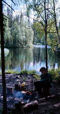 Za visutým mostem bylo další tábořiště. Večer jsme seděli u ohniště s železným roštem, kolem lavice z tlustých kmenů, opět hraji na kytaru, v kotlíku se vaří čaj, v batohu do něj čeká rum. Vtom mi něco zavonělo pod nosem. No ano – jsme ve Finsku, ráji rybářů. Kluci ulovili nějaké ryby, přemluvili bioložku Ivanu, aby je připravila, a rybí pochoutka teď koluje kolem ohně.