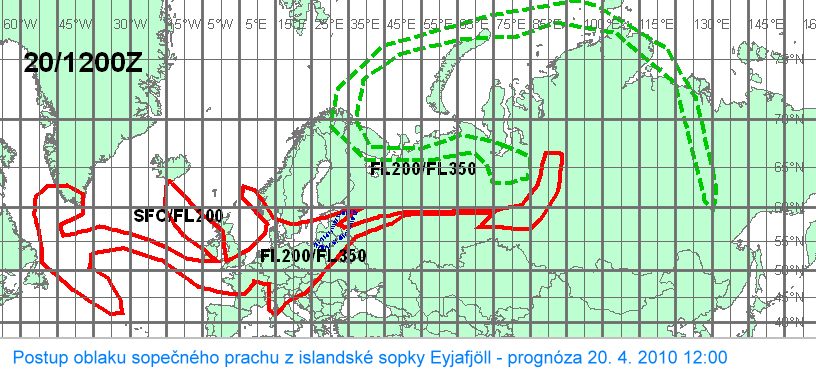 Mamutí oblak kouře se pomalu posouvá z Islandu na jihovýchod. Podle ruské agentury ITAR-TASS již zasahuje až nad Kolský poloostrov, podle agentury PAP i nad území Polska. Pokud bude oblak postupovat podle prognóz, veškerý vzdušný provoz se dnes zastaví i nad Českem.
